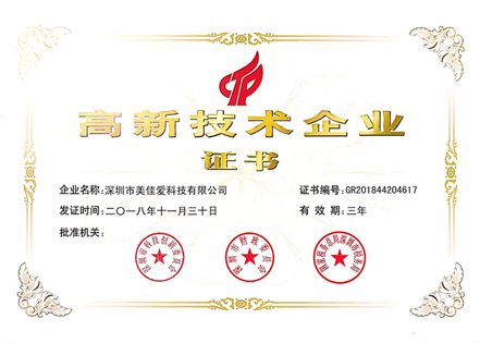 美佳愛(ài)科技高新技術(shù)企業(yè)認(rèn)證證書