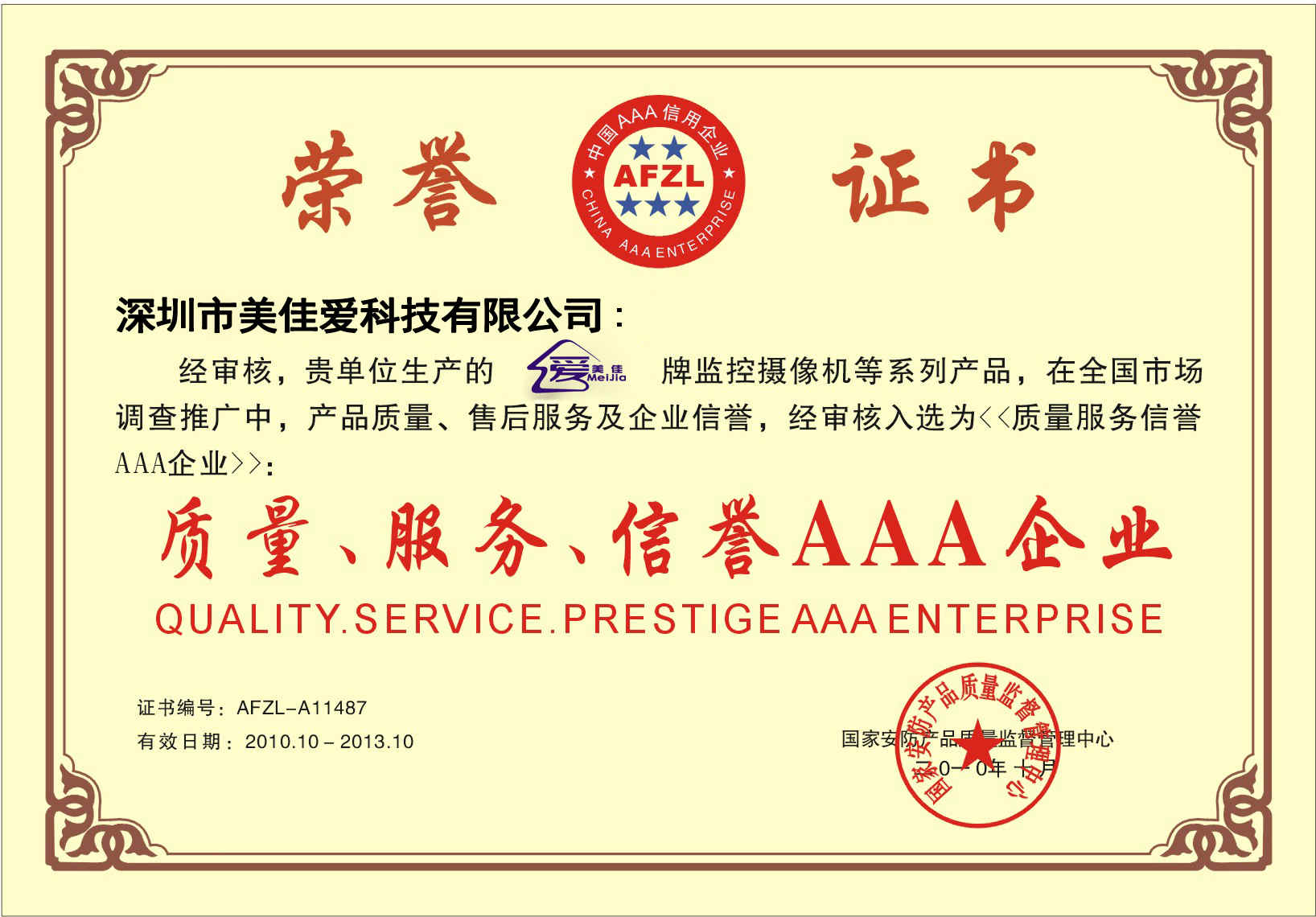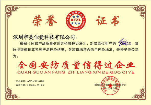 全國(guó)安防質(zhì)量信得過(guò)企業(yè)證書副本